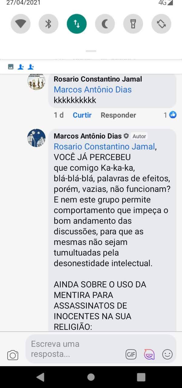 5 - Até o acima exposto, o sr Jamal já havia sido advertido, como prevêem  as Regras do Grupo, por mais de duas vezes. Ele, então, ACUSOU-ME DE QUERER SILENCIAR-LHE. E EU O FIZ VER o seguinte: mesmo eu tendo a prerrogativa, eu não tinha feito isso. Antes, debati com ele de maneira dura, porém, respeitosa. Ou seja, sem Ka-ka-ka; sem  blá-blá-blá; sem palavras de efeitos, porém, vazias de razão (e cheia de arrogância); sem ofendê-lo pessoalmente, com ele tinha feito comigo e com outro seu interlocutor.